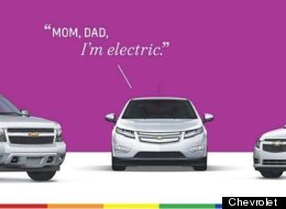 The tongue-in-cheek new ad depicts the silver Chevy Volt as "coming out" to his older-model "parents," along with the text: "Volt runs on an electric battery and a gas generator. So, whatever revs your engine, we support you 100 percent. Happy Motor City Pride from the entire Chevrolet family.”