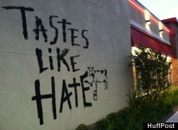 The graffiti, which depicts a cartoon cow painting the words "Tastes Like Hate" on a wall, is a play on the restaurant chain's advertising campaign in which cows paint messages on signs and billboards urging people to eat more chicken.