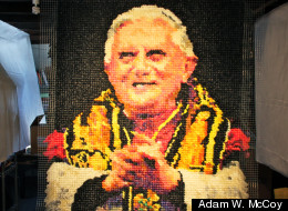 The 25-year-old responded with "Eggs Benedict" -- a portrait of the Roman Catholic leader created with 17,000 colored, non-lubricated condoms.