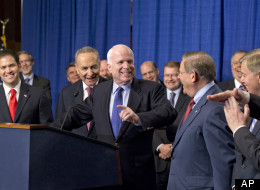 Undocumented immigrants and advocates in the crowd, many of them young so-called Dreamers, broke out into applause and chants of "yes we can!" after Vice President Joe Biden, who came to the Senate to preside over the proceedings, read the results. Senators in the bipartisan "gang of eight" that drafted the bill -- Sens. John McCain (R-Ariz.), Marco Rubio (R-Fla.), Lindsey Graham (R-S.C.), Jeff Flake (R-Ariz.), Chuck Schumer (D-N.Y.), Dick Durbin (D-Ill.), Bob Menendez (D-N.J.) and Michael Bennet (D-Colo.) -- patted each other on the back.