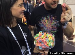Liz Von Hasseln, left, the creative director of food products for 3D Systems, holds a bowl of printed candy at the International CES on January 9, 2014.