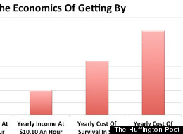 In other words, nearly one in five women in America with young children toil away at jobs that don't pay enough to support them. That's because, as you can see from the chart below, based on the Economic Policy Institute's Family Budget Calculator, even $10.10 an hour is not enough to support a single mother and one child, no matter where she lives -- whether in high-cost New York City or low-cost South Dakota: