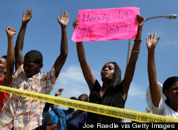 FERGUSON, MO - AUGUST 11: Demonstrators protest the killing of 18-year-old Michael Brown who was shot by police on Saturday on August 11, 2014 in Ferguson, Missouri. Police responded with tear gas and rubber bullets as residents and their supporters protested the shooting by police of an unarmed black teenager named Michael Brown who was killed Saturday in this suburban St. Louis community. Yesterday 32 arrests were made after protests turned into rioting and looting in Ferguson. (Photo by Scott Olson/Getty Images)