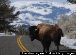 FILE - In this March 17,2011 file photo Bison roam out of the entrance to Yellowstone National Park in Gardiner, Mont. Montana is looking more and more to individual hunters to kill problem animals, including wolves that are well into their reproductive cycles and wild bison that roam beyond designated areas. One regulator says the proposed policies are unwittingly putting hunters in fix: Would they be participating in ethical hunts or would they be reduced to wildlife management mercenaries? (AP Photo/Janie Osborne,File)