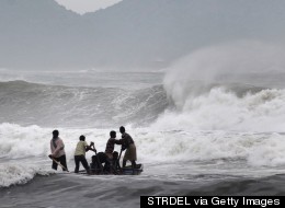 VISAKHAPATNAM, INDIA - OCTOBER 11: People evacuated as Cyclone Hudhud is expected to hit the coast of Andhra Pradesh and Odisha tomorrow at Bheemili village, on October 11, 2014 in Visakhapatnam, India. Around 1.1 lakh people in Andhra and more than 26,000 in Odisha were evacuated on Saturday as it started raining heavily and the seas turned choppy. All fishing operations were suspended in six districts of Andhra and four of Odisha. Over two lakh people living in and around the vulnerable coastal districts of Andhra Pradesh and Odisha have been evacuated. Visakhapatnam city and district and the four adjacent districts - Srikakulam, Vizianagam towards north and East and West Godavari districts to the south are on high alert and are bracing for Hudhud, which stopped shy of becoming a super cyclone. (Photo by Arun Sharma/Hindustan Times via Getty Images)