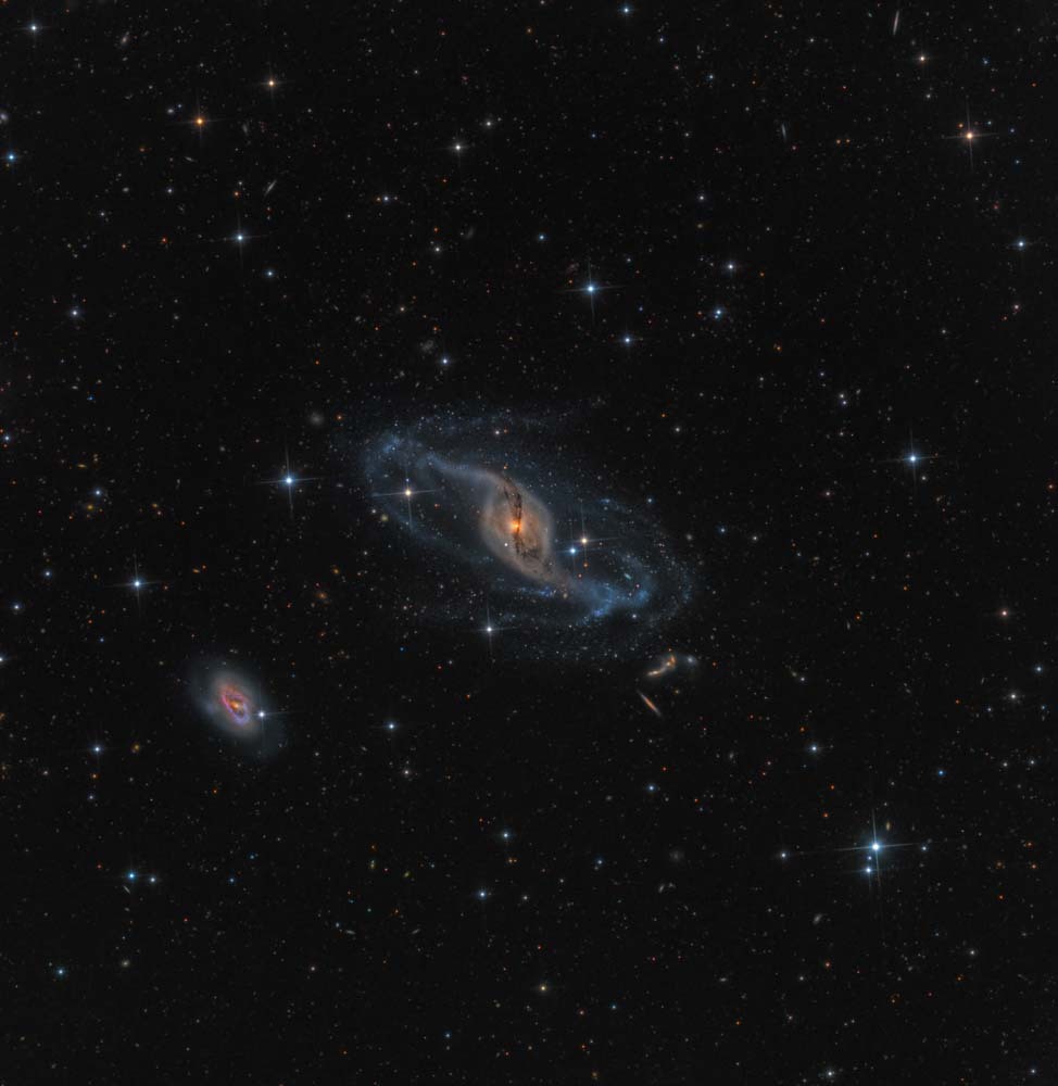 Measuring 50 light years in diameter, the large, round Rosette Nebula is found on the edge of a molecular cloud in the constellation of Monoceros the Unicorn. At the core of the nebula the very hot young stars have heated the surrounding gaseous shell to a temperature in the order of 6 million kelvins resulting in the emission of copious amounts of X-Rays. Here the photographer has applied a false colour palette to several pictures using narrowband filters, which only allow a specific colour of light to reach the camera, with each one linked to an interstellar gas, resulting in the striking blues and oranges.
