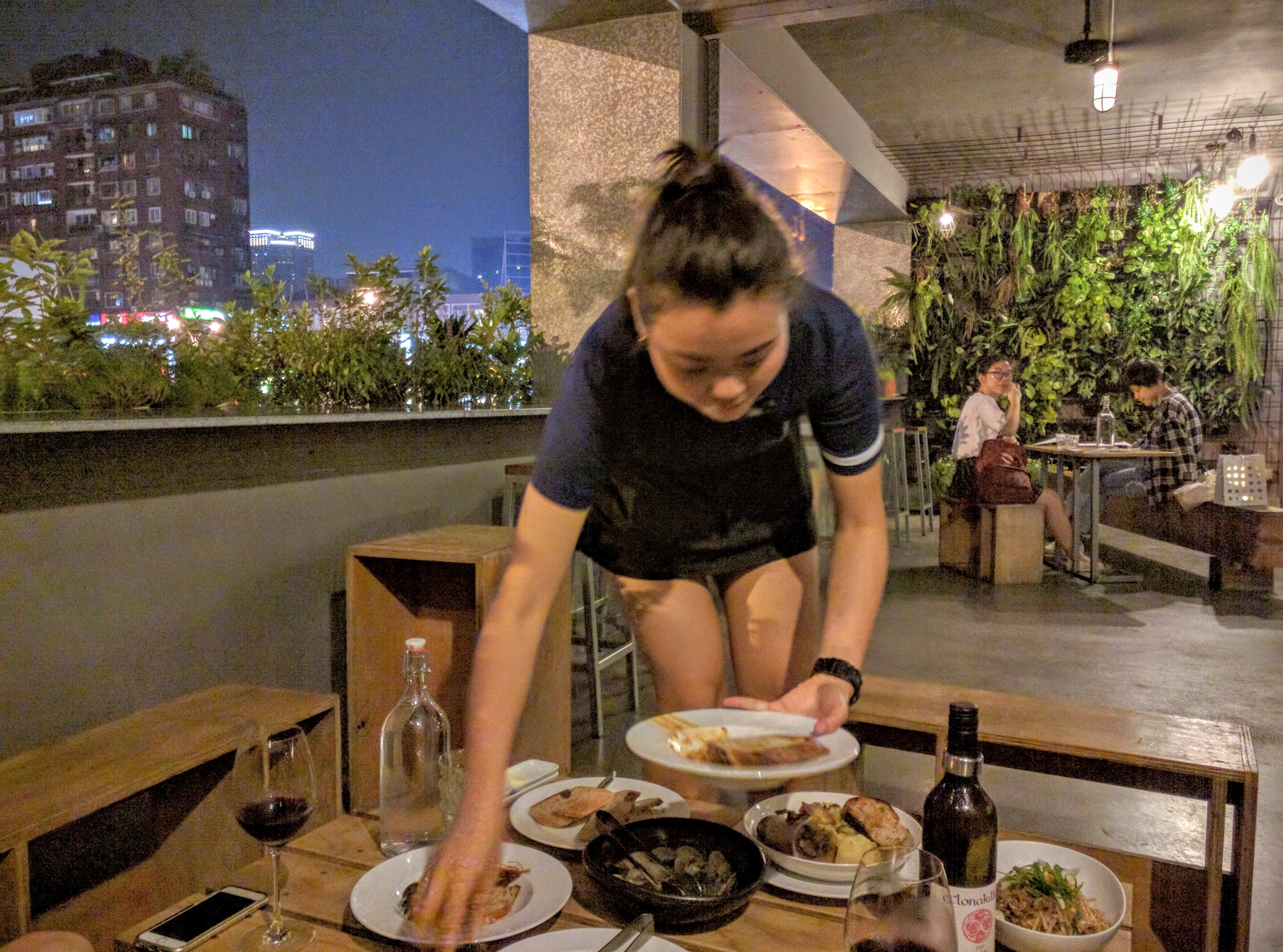 But the highlight for me was the second-floor balcony that allowed guests to commune with the sights and sounds of the street. It had a yesteryear feel for what Taipei must have been like 30 years ago, before air conditioning and digital screens isolated us in our boxes. I had to return for lunch the next day, just to get my fill of this balcony. This was where I was the day the Hyatt doorman gave me his umbrella, and I relished my sensory experience of the thundering downpour and the thick, sultry air while I sat inches away, at my lovely, dry table.