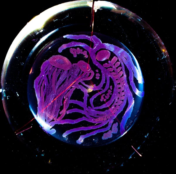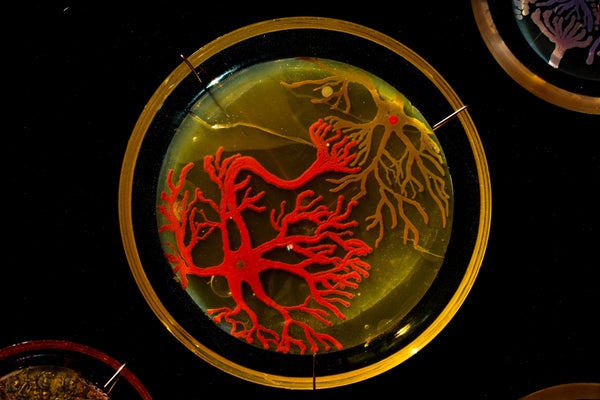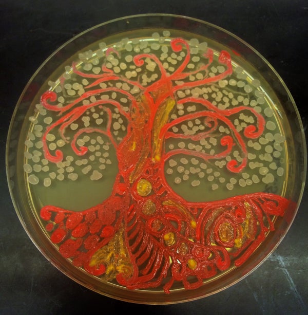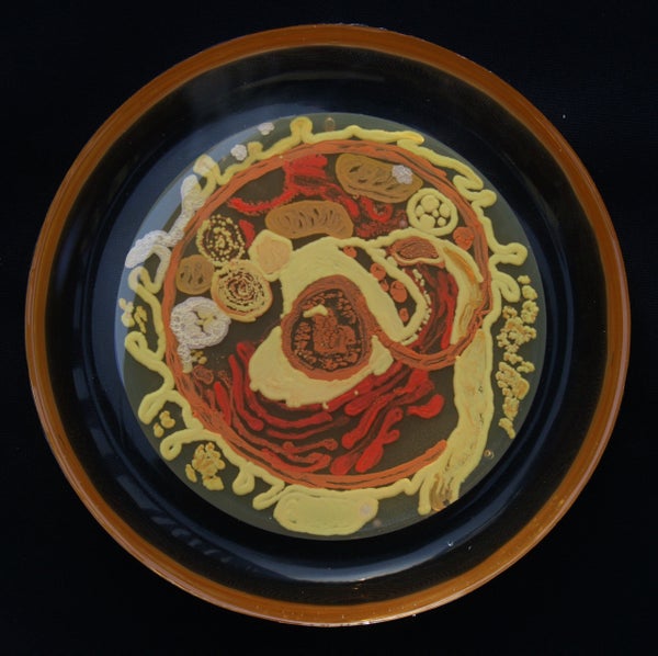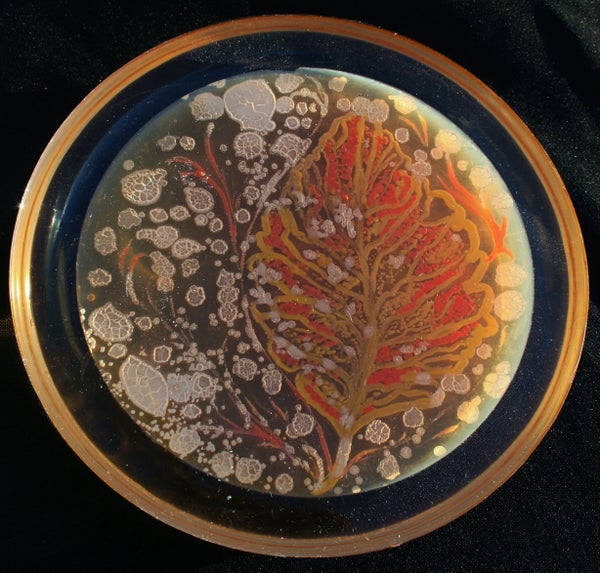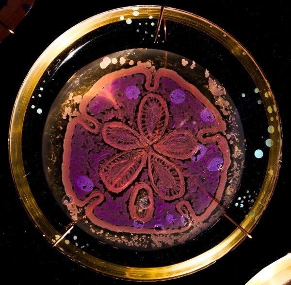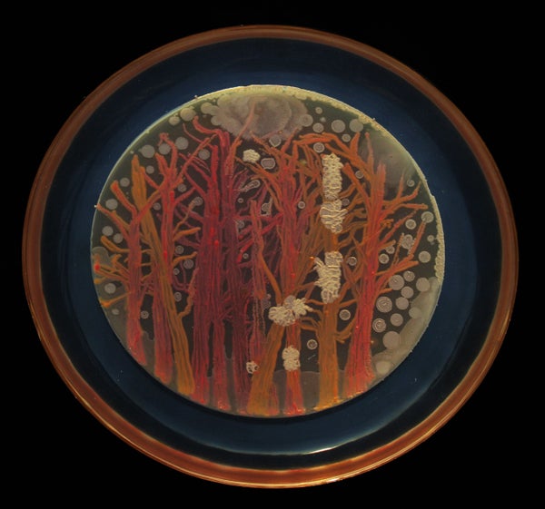 Berkmen taught Peñil how to "paint" with bacteria on agar, a gelatinous substance in which jungles of bacteria can grow. The artist uses a petri dish as her canvas.