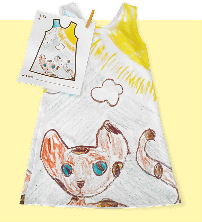 The process is simple: Parents choose a dress size and print out the coloring book-style templates available on the “Picture This” website. Once their kids have colored and decorated the templates, the grown-ups can upload photos of the completed designs on the website and place their orders. The finished dresses arrive within a few weeks.