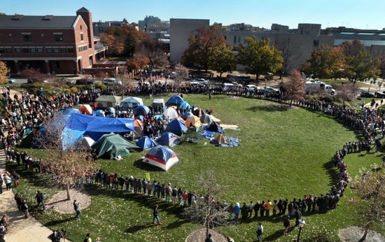 University of Missouri students circle tents on the Carnahan Quadrangle, locking arms to prevent media from entering the space following the resignation of President Timothy W. Wolfe on Monday, Nov. 9, 2015. (Robert Cohen/St. Louis Post-Dispatch/TNS via Getty Images)