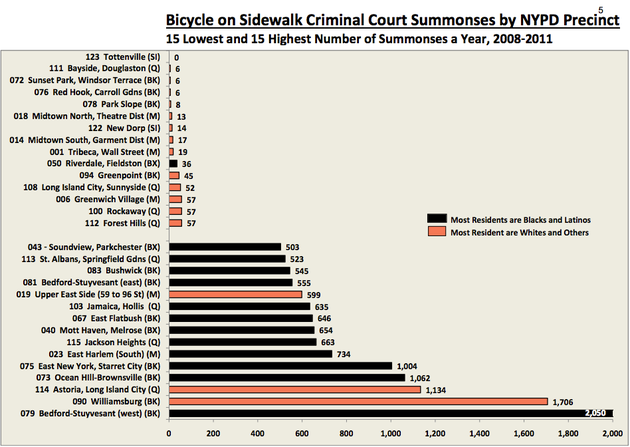 Think of Park Slope, an affluent and predominantly white neighborhood in Brooklyn, where, between 2008 and 2011, police doled out an average of eight tickets a year for riding a bike on a sidewalk. Then think about Bedford-Stuyvesant, a poorer and predominantly black neighborhood a few miles away, where the average number of such tickets is 2,050 per year.