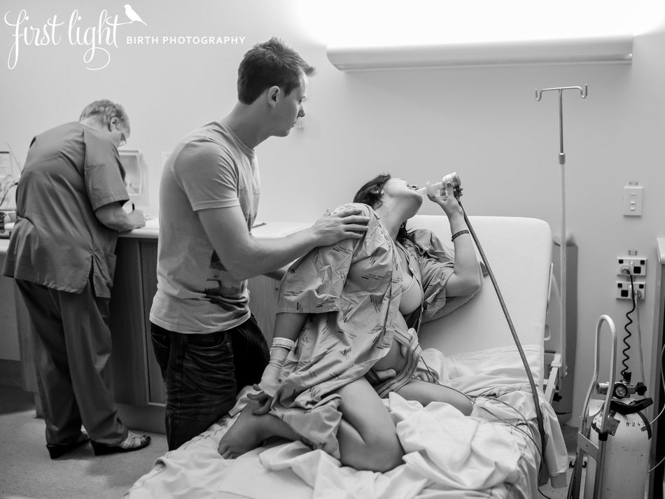 This mom is using gas for pain relief, which is common in New Zealand. It doesn’t exactly take away the pain, but it helps a mother relax and take her mind off it. In the background, you can see her midwife taking notes. In New Zealand we have free