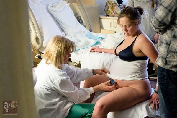 "This mama had a great birth team. Here, the nurse is attaching a mobile fetal monitor so the mama could move around. She welcomed her second baby boy to the world shortly after this photo was taken."