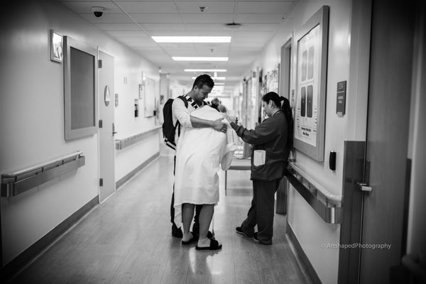 "Tristan (RN) introduces Keilan to his mother Danielle for the first time in the ICU, almost 48 hours after his birth via crash C-section. Danielle narrowly survived HELLP syndrome, which caused her liver to rupture in early labor. This image was taken just after she first regained consciousness after the C-section and surgery to repair her liver and was able to meet her baby (and learn it was a boy). There was not a dry eye on that entire floor."