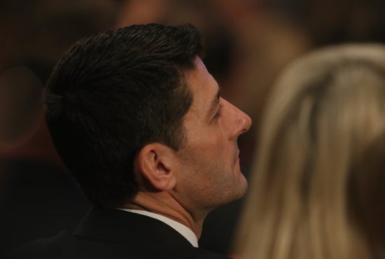 House Speaker Paul Ryan watches the Republican Presidential Debate sponsored by Fox Business and the Wall Street Journal at the Milwaukee Theatre November 10, 2015 in Milwaukee, Wisconsin.