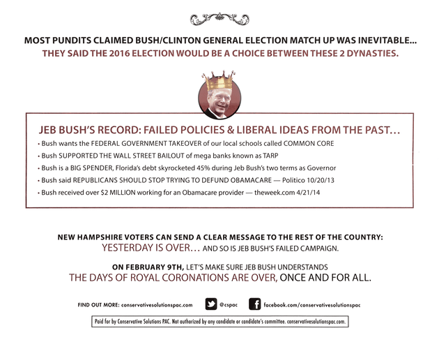 The mailer then lists what it refers to as Jeb Bush’s “failed policies” and “liberal ideas from the past.”