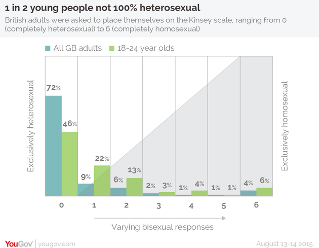 YouGov conducted an online poll of 1,632 British adults between the ages of 18 and 60+ last week. Participants were asked to rank themselves on the Kinsey Scale, developed by Alfred Kinsey and researchers in 1948 to show that people do not necessarily identify themselves using rigid categories like exclusively straight (a zero on the scale) or exclusively gay (a six on the scale).