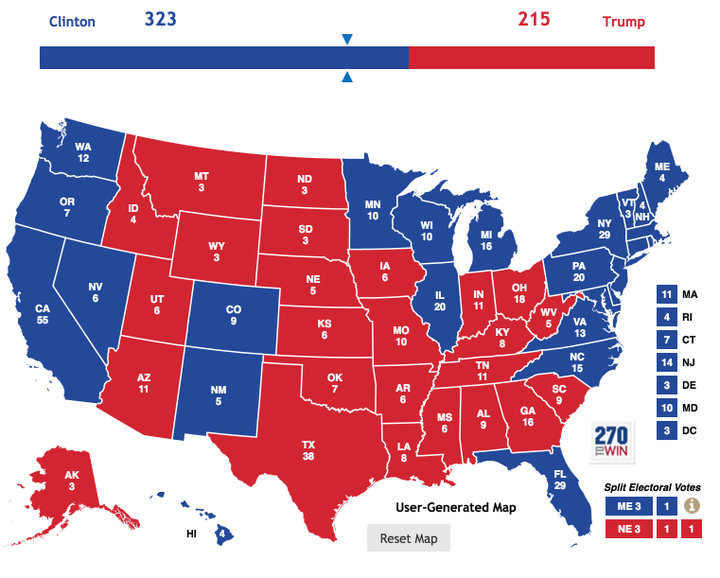 Clinton’s win will be substantial, but not overwhelming. The model projects that she’ll garner 323 electoral votes to Trump’s 215.