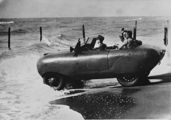 An amphibian car entering in the sea in Ostia, Italy, in 1910.