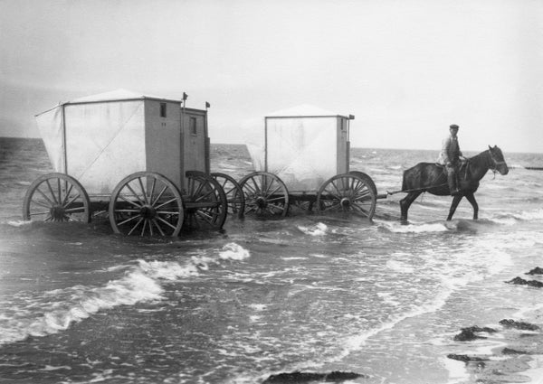 Bathing machines that were used for changing in and swimming from at a seaside resort at the North Sea coast in Germany in 1895.