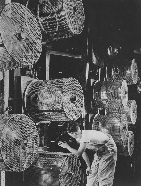 A worker adjusting the dial on a machine used for Vitamin A extraction in 1950. (A number of cooling fans dot the side of the machine.)