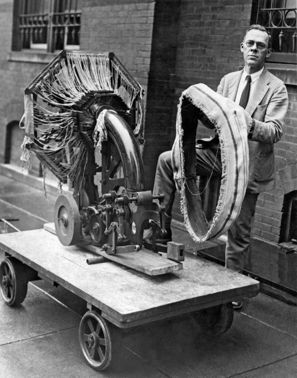 A Smithsonian Institute official holding a portable tire-making device in Washington, D.C., on Aug. 21, 1925.