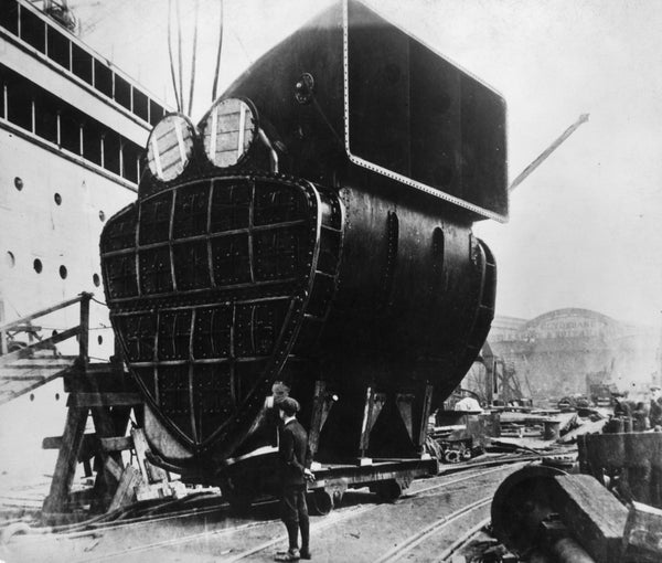 A giant condenser being hoisted up to its position on board the Cunard liner Aquitania during its construction at the John Brown & Company shipyard in 1912.