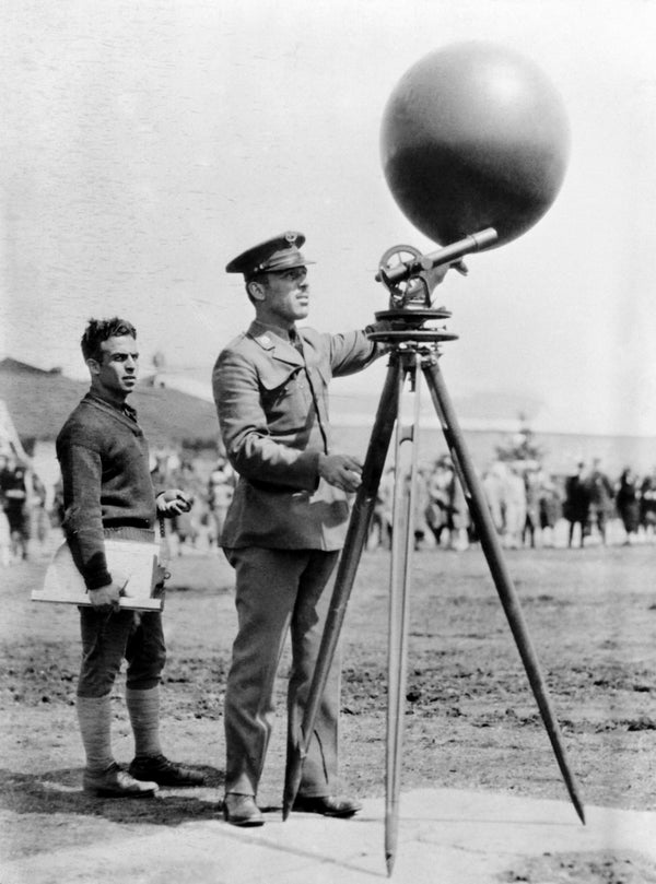 Joseph Danko standing next to an invention that helps determine the direction of the wind in 1920.