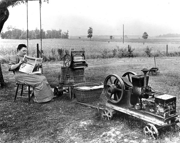 A woman waiting for her gas-powered washing machine to finish a load of clothing in 1914.