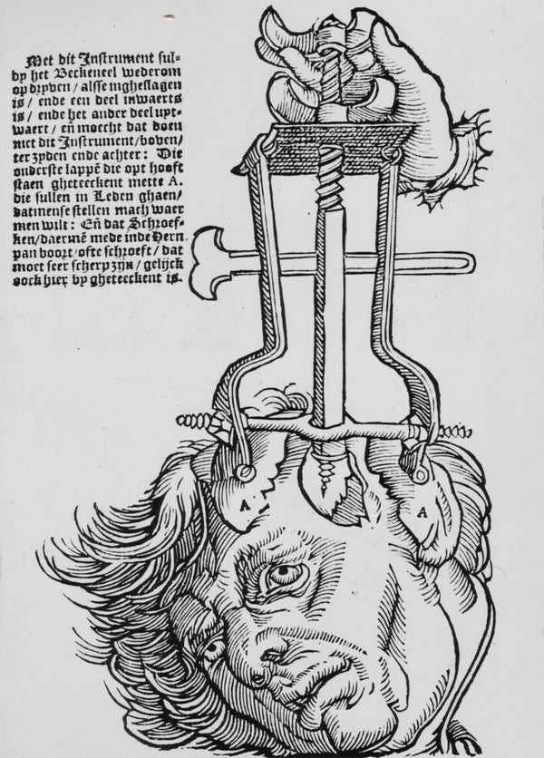 An illustration of the trephination elevator, which was used for removing fragments of broken skull, as seen in a book on field surgery in 1593.