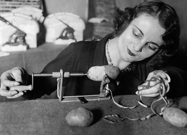 Woman using a potato peeling machine in 1932.