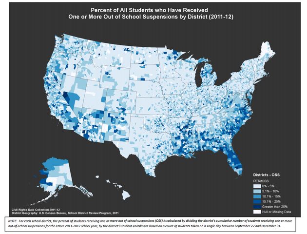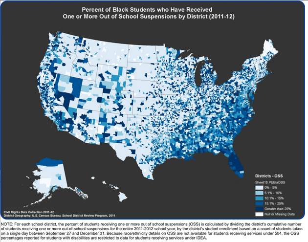 The maps below, based on data collected by the Office for Civil Rights during the 2011-2012 school year, shows the percentage of students who received out-of-school suspensions. Research shows that students who have been suspended from school are more likely to later drop out and slip into the juvenile justice system.