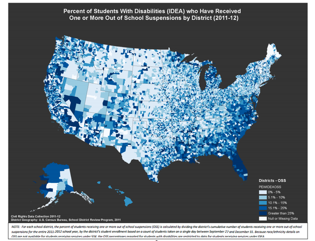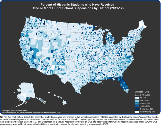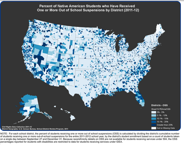 The U.S. Department of Education on Wednesday released maps detailing where students are most likely to get suspended from school, with specifics for Native Americans, blacks, Hispanics and those with disabilities. The department published the maps the same day the White House hosted a conference on school discipline, where school leaders, government officials and educators discussed best practices for ending the school-to-prison pipeline.