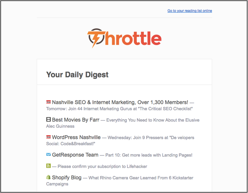 I DON'T use Throttle to collect spammy content I don't want. I'll never have time for unnecessary email and just unsubscribe from those (more on that below). I DO use Throttle every time I sign up for something I actually want but don't need to see in my inbox every day. I like to save my inbox for just the most critical email. Here's a quick list of emails that I now have Throttle handling for me: