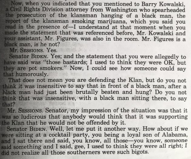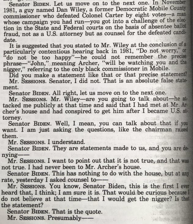 Biden also asked Sessions about the allegation that he had used a racial slur after a court hearing when he was in private practice. (The term appears uncensored in the transcript below. The U.S. Senate didn’t approve C-SPAN cameras until later that year.)