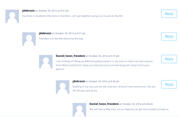 Stop the Steal’s website also offers a platform where newly registered members can link up with others in the same state. Below is a conversation between volunteers in Ohio about meeting up on Election Day: