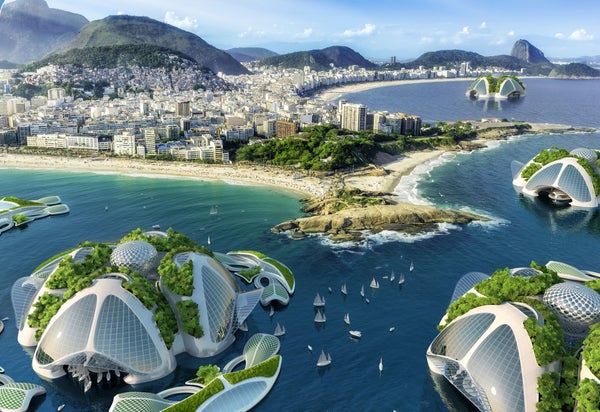 That's according to Paris-based architect Vincent Callebaut, who released a series of futuristic and delightful drawings last week showing what sustainable, floating cities of "oceanscrapers" off the coast of Rio de Janeiro could possibly look like.