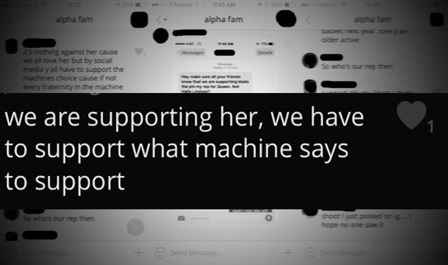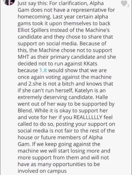 Screenshots of messages that members of Alpha Gamma Delta exchanged with each other, obtained by The Huffington Post, indicate that sorority sisters worried about the social consequences of not following the wishes of members of the Machine. A message one sister sent through the group messaging app GroupMe speculated that because some Alpha Gamma Delta members publicly supported Spillers for president the previous semester, the Machine's members declined to back their sorority's candidate for homecoming.