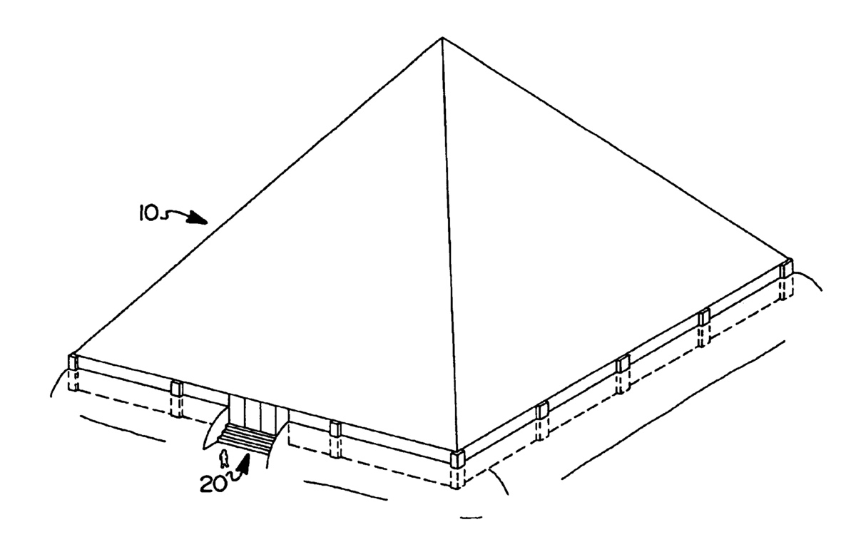 U.S. Patent OfficeIs it possible to patent one of the wonders of the world? In a manner of speaking, yes. In 2002, inventors Daniel Thomas Dudek and Pamela Rene Heard successfully filed a patent on "burial structures providing space for multiple human remains" that "gives lasting, beautiful and reverent surroundings for the deceased." Above is the drawing included in the application. Look familiar? -