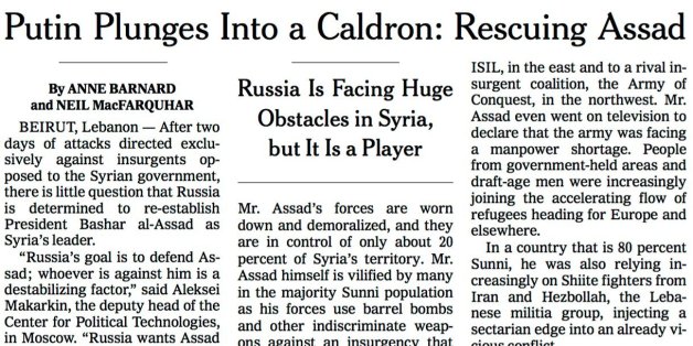 An editorial tailwind carried the paper's fascination with the moderate rebels into a second day of coverage on October 2. A story by Barnard and MacFarquhar, "Vladimir Putin Plunges into a Caldron in Syria," speculates that Putin's entry into the war will push "independent Islamists" to ally themselves with al-Nusra, and hence presumably will take them a degree closer to ISIS. "One previously independent Islamist brigade declared its allegiance to the Nusra Front, saying unity was necessary because America and Russia were allied against Muslims 'to blur the light of truth.'" Once more, there is a nagging hint of unasked questions. What exactly is an "independent Islamist"? How close was this brigade to the "democratic values" that America espouses? Indeed, how close could it have been if the allure of al-Nusra was just a bombing attack away?