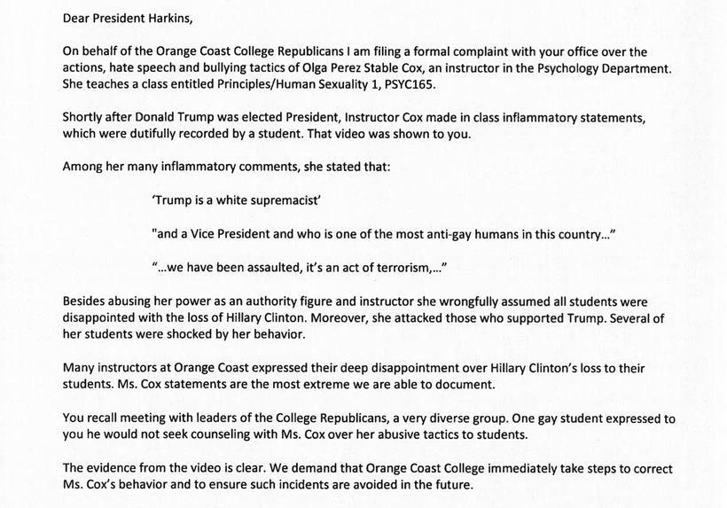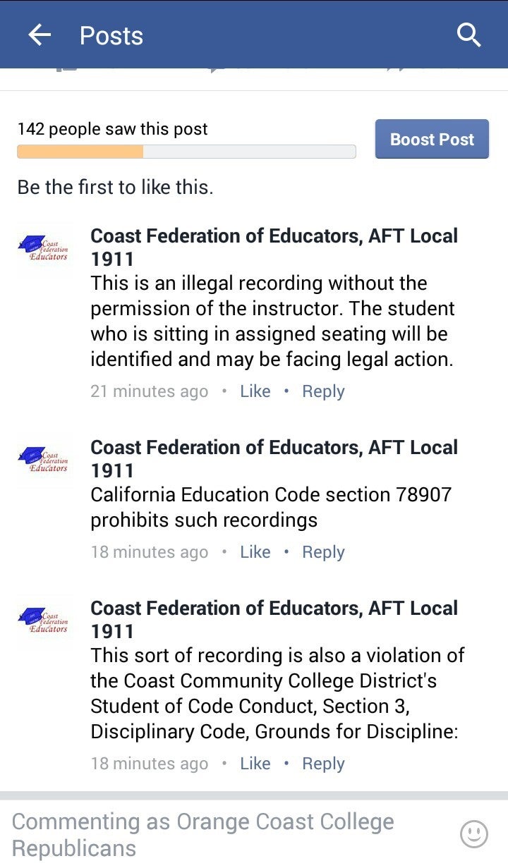 On the Orange Coast College Republicans Facebook page, the Coast Federation of Educators union threatened action against whomever shot the video: