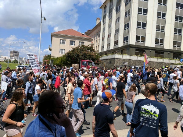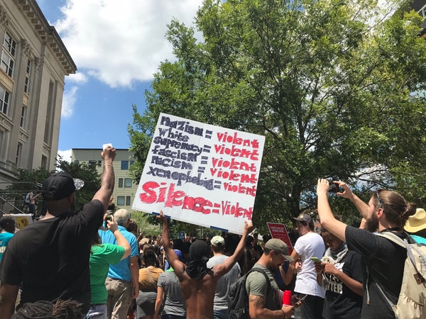 As the counterprotest wore on, part of the crowd held a dance-off, while chants of “Durham resists hate” rang out. Many cheered for those arrested for tearing down a Confederate statue in the city earlier this week.