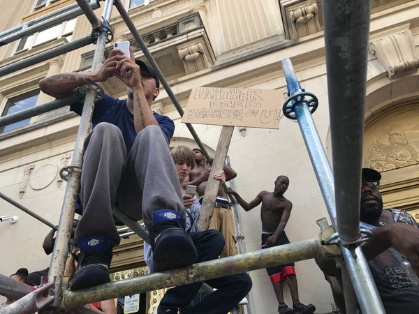 In one such confrontation, the crowd yelled “F**k you cowards” at two men, though it’s not clear what prompted the clash.