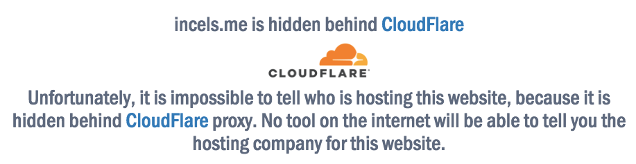 Domain hosts will sometimes take a site down if they receive complaints about its content, but Cloudflare can hinder this process as well. It offers services that can hide a site’s host provider and IP address, as it appears to be doing for Incels.me, making it difficult for concerned netizens to know where to direct their complaints.