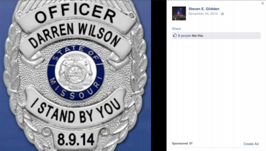 Among the numerous pro-gun and pro-cop memes Glidden has posted to his Facebook wall over the past four years, since killing Chambers, there is a picture of a badge. “Officer Wilson, I stand by you. 8.9.14,” the badge reads. Wilson, a white officer in Ferguson, Missouri, shot and killed an 18-year-old black teen named Michael Brown on Aug. 9, 2014. Brown’s death sparked national protests and was a catalyst for the Black Lives Matter movement.